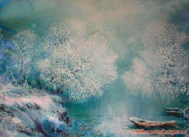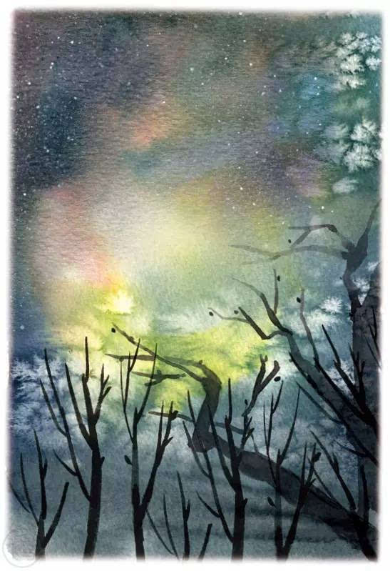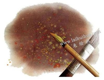 颜色未干时撒上细盐粒,干后出现像雪花般的肌理趣味。撒盐时,应视画面的干湿程度,过早撒盐会被水分溶解,过晚会失去作用。盐粒在画面上要撒得疏密有致,随便乱撒,会前功尽弃。