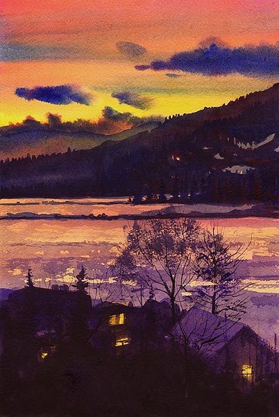 水是水彩画的生命,用水调色,能够产生魔术般的画面效果,通过水色交融产生流动、浑然、明朗、酣畅、淋漓、朦胧、抒情、自然天成。