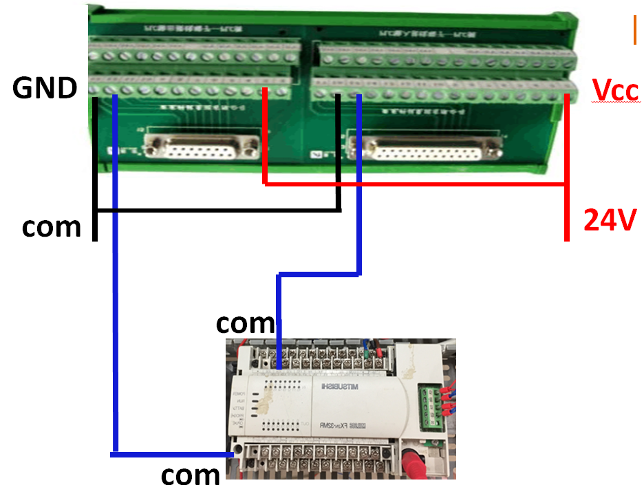 在PLC端,首先要给接线板供电。从电源盒引出24V电源,分别接入两个模块的VCC端口,如图3-18红线所示。同理,从电源盒引出0V(COM),分别接入两个模块的GND端口,如图3-18黑线所示。将PLC上所有用到的COM端口连接到接线板的GND端口,如图3-18蓝线所示。
