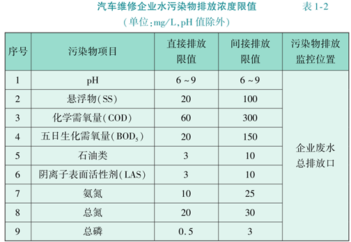 对于废水,各单位应该按照《中华人民共和国水污染防治法》、《汽车维修业水污染物排放标准》等相关文件要求,对废水经适当处理并达到排放标准后再排放,如表所示。