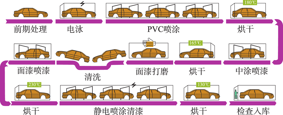 汽车制造涂装为了能满足大批量、流水线、自动化、高效率生产形式,一般使用烘烤聚合型涂料,采用电泳、静电喷涂等形式来进行涂层的涂装。每道涂层完成后,在130~230℃高温下烘烤干燥,故原厂漆也叫高温漆。