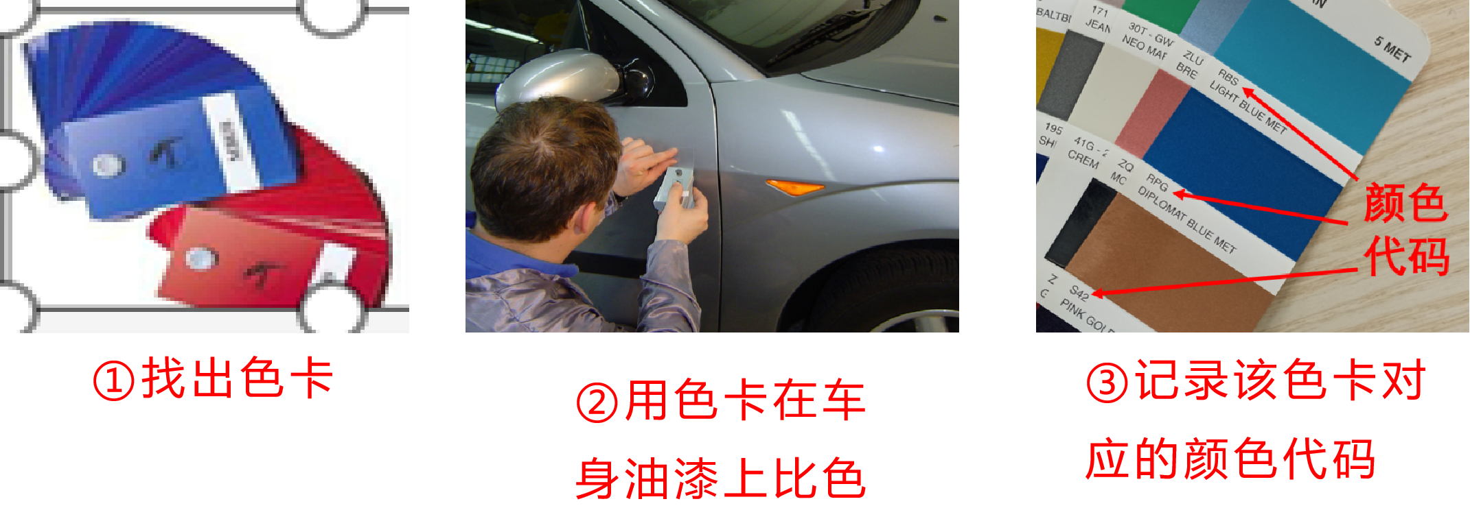 注意:通过色卡比对得到的颜色代码所代表的颜色是汽车或目标板实际的颜色,这种方法适用于所有情况,但前提是所用涂料品牌色卡资料必须齐全。