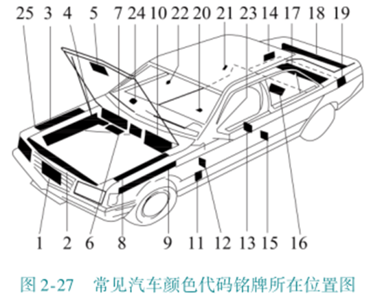 不同公司,其代码编制规则不一样,一般为数字或字母或其组合形式。不同型号的汽车,其颜色代码铭牌所在位置也有所不同,一般所在位置如下图所示。