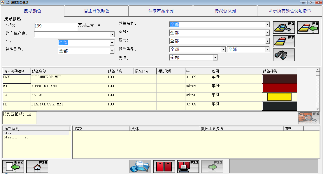 ④分析颜色搜寻结果界面,根据里面提供的信息(如汽车生产商、颜色名称、颜色代码、生产年份、应用部位、涂料系列等),逐步确认并点击,最后就进入到配方界面。