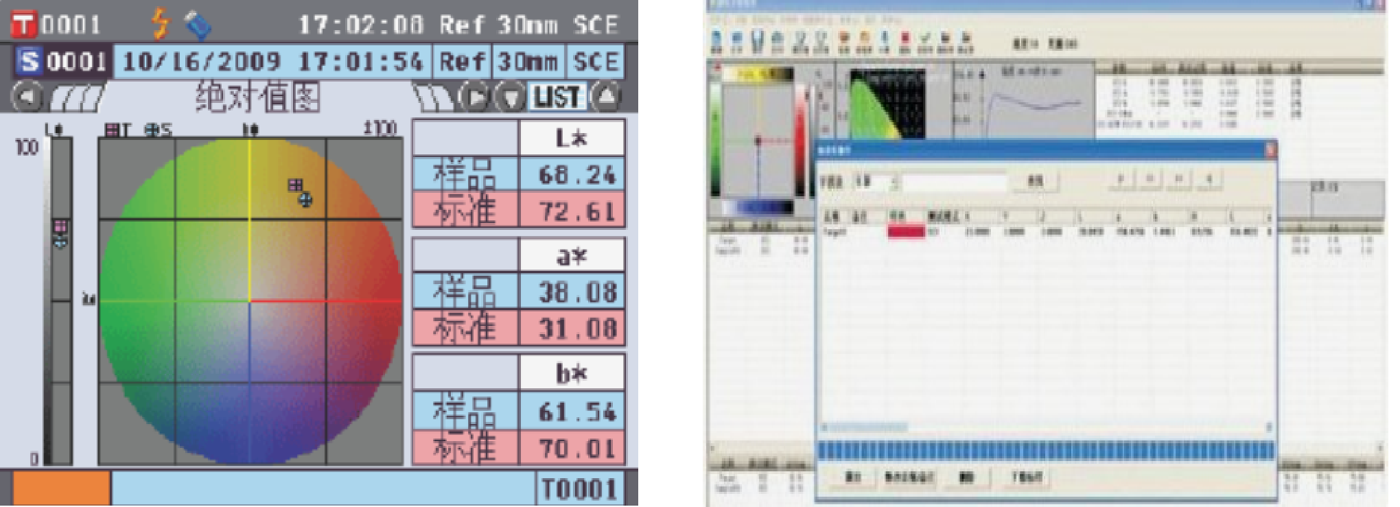 测色仪全称多角度分光光度仪/色差仪,它主要根据CIE L*a*b*原理(国际光线标准组织推荐的色彩管理标准),测量显示出样品与被测样品的色差△E以及 △Lab值、反射率等数据。