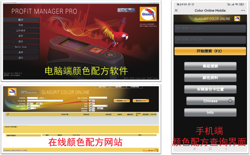 目前一些规范的汽车涂料公司都有自己完善的颜色配方系统,用户通过安装计算机客户端、手机APP,或者登陆颜色查询网站、微信公众号等方式,将颜色代码或相关信息输入颜色查询界面,就可以查到所需要的颜色配方及相关信息。