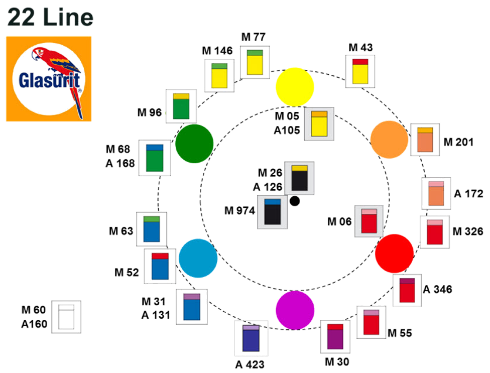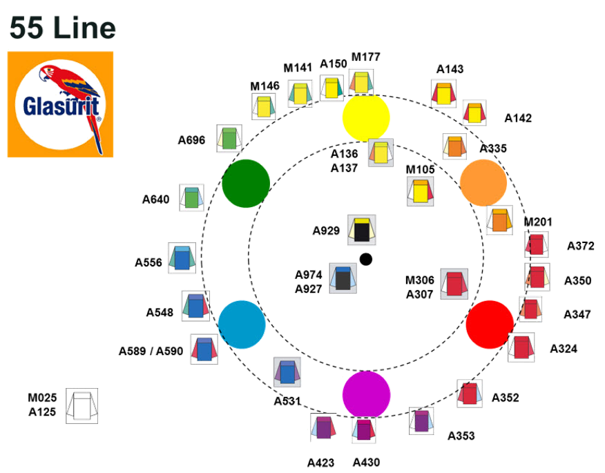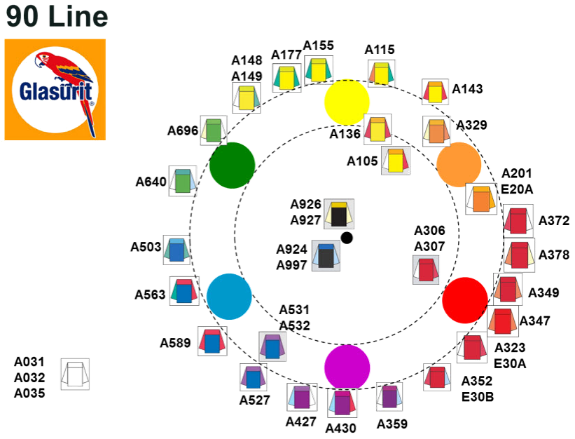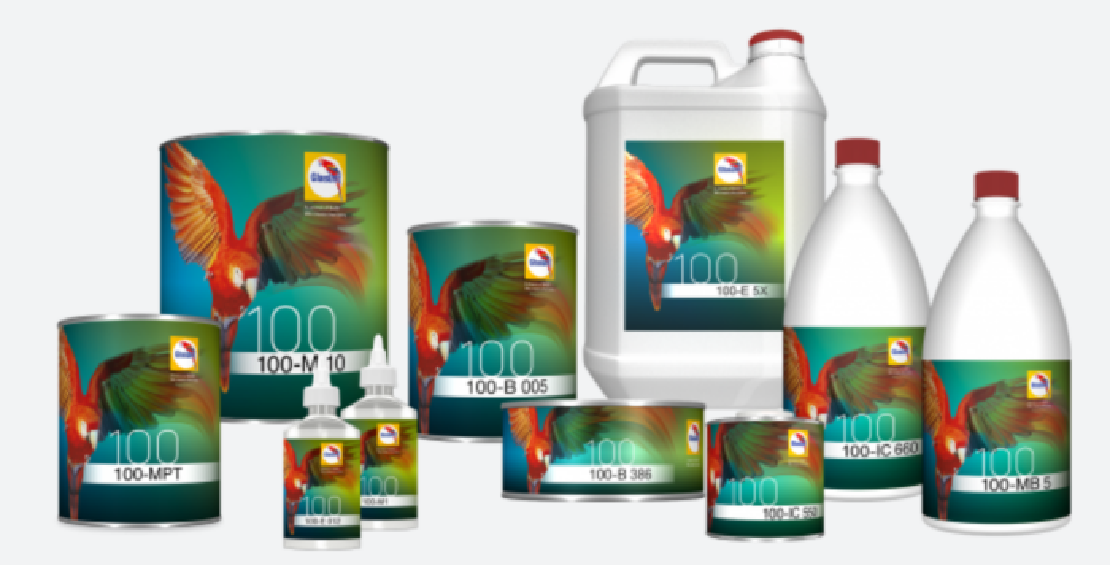 双工序和多工序涂料中的底色漆,属于单组份色母,也称为1K色母。这类色母只需要通过添加稀释剂调整施工粘度后即可进行喷涂施工(图片所示为某品牌55系列部分溶剂型单组份色母)。