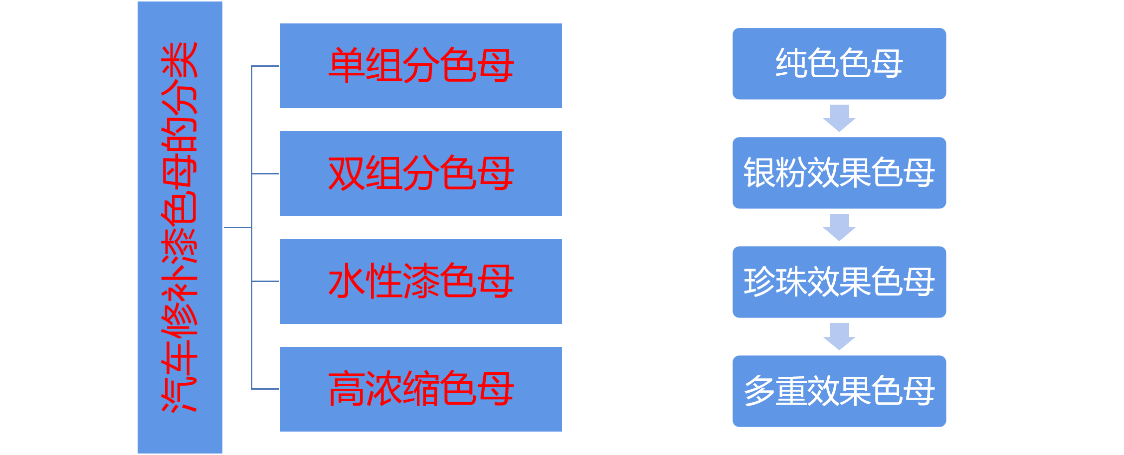 双工序或多工序涂料中的单组分底色漆色母通常包括:纯色色母、银粉效果色母、珍珠效果色母和多重效果色母等。
