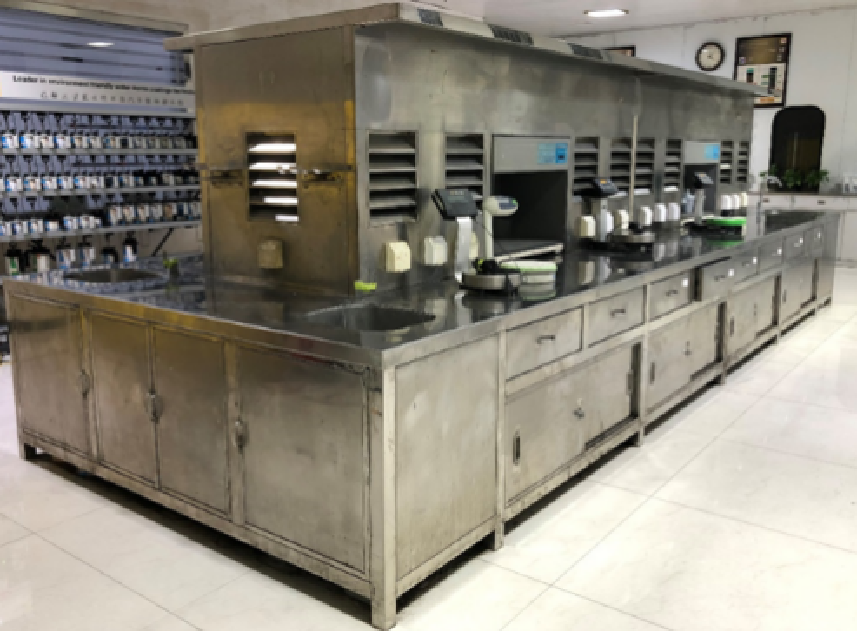 调漆台主要用于调漆时摆放常用的工具、设备及涂料,一般采用易清洁、耐溶剂、防火材质制作。调漆台上要有排气装置,能将调漆时挥发出来的溶剂气体及时排出。调漆台下部可设置一些抽屉和柜子,以便存放一些常用工具和材料。