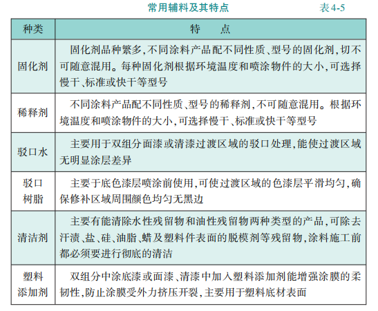 汽车维修涂装工作中其它常用的辅料,如固化剂、稀释剂、驳口水、驳口树脂、清洁剂、塑料添加剂等,其特点及用途可以参考下表。