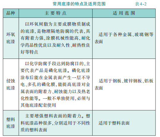 汽车维修业中常用的底漆有环氧底漆、侵蚀底漆和塑料底漆,这些底漆各自的特点及用途如表所示。