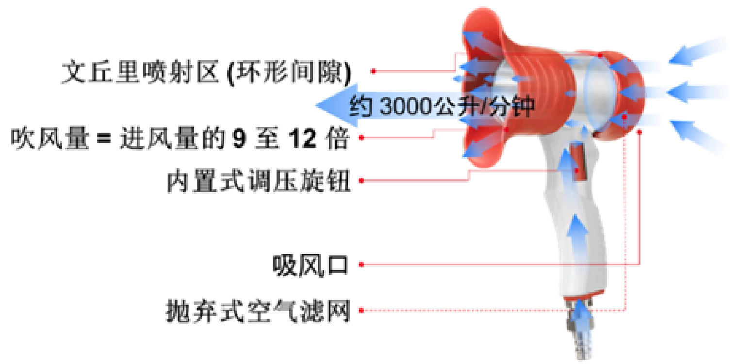 吹风筒主要用于水性底色漆涂层的加速干燥,它利用文丘里原理,可以用最少的耗气量,达到覆盖面大、风量大而均匀的效果。吹风筒的结构及特点如图所示。