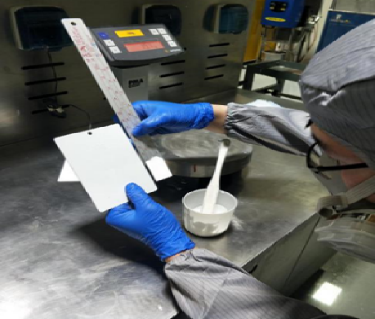直接比较法就是用搅拌尺将混合均匀的涂料挑起后与目标颜色直接比对的方法,如图所示。直接比较法进行颜色比对最为简单,但涂层颜色存在干、湿效果之间的差别。