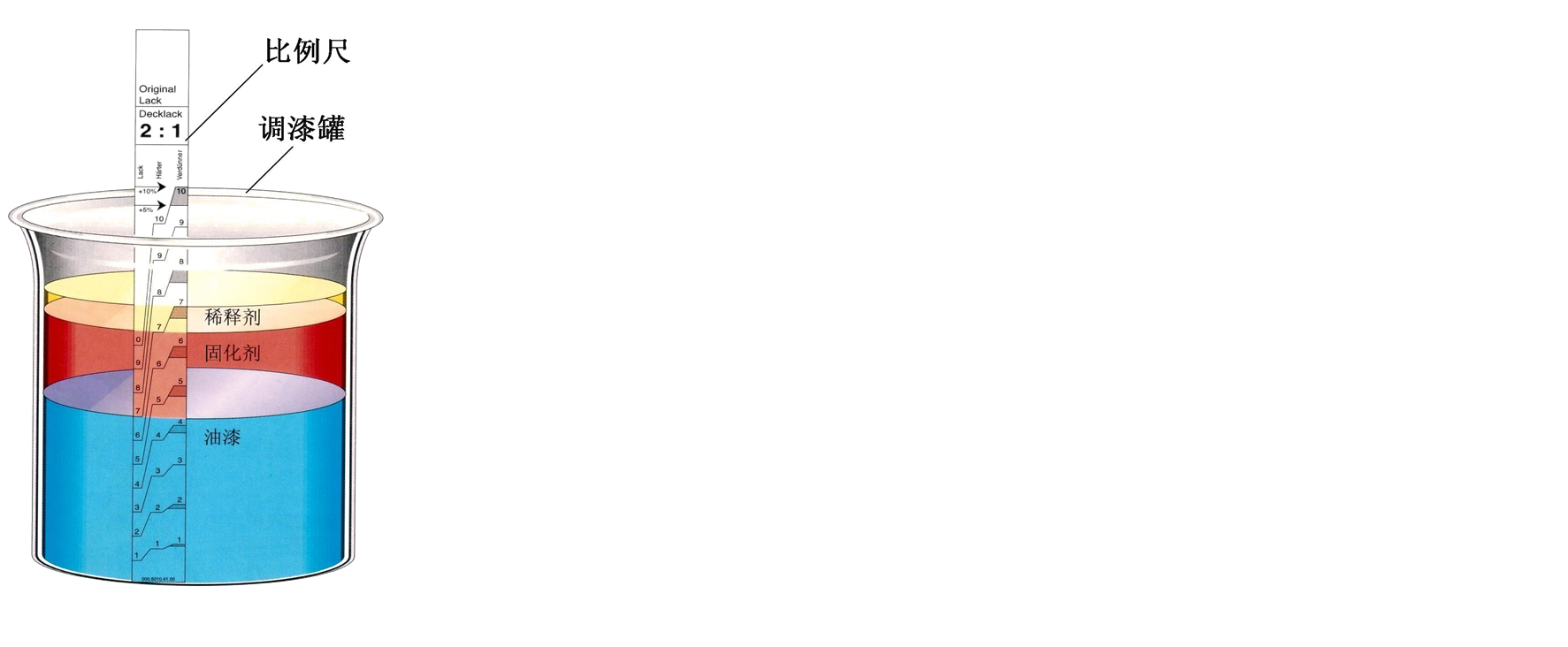 ①调配涂料。倒出适量的涂料,每次只倒出够喷涂一个颜色样板的量即可,大约30-50g,并按产品技术说明添加配套的固化剂、稀释剂等辅料,并搅拌均匀。如图所示为某品牌单工序双组份纯色面漆产品的调配及喷涂技术说明。