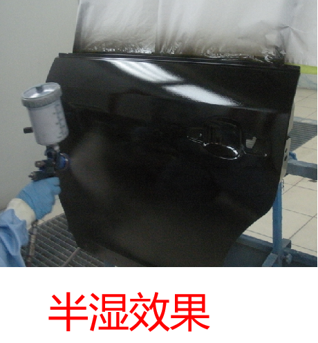 半湿喷介于雾喷和湿喷之间,一般指涂膜厚度刚刚形成湿润的、均匀的效果的喷涂手法。半湿喷手法一般用于金属底色漆、珍珠底色漆、水性底色漆的喷涂。在施工时也可以通过控制喷涂速度来达到半湿喷效果,它的喷涂速度一般快于湿喷,慢于雾喷。