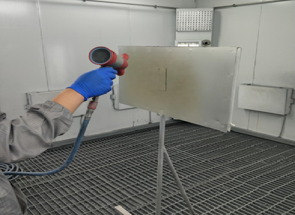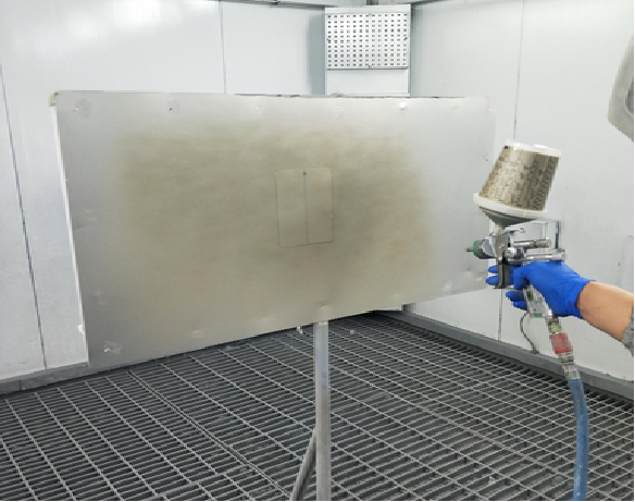 第二层底色漆喷涂:重复第一层色漆喷涂方法,将整个试板表面均匀地湿喷一层。这一层比第一层稍厚一点,但不能出现底色漆垂流。然后再使用文丘里吹风筒吹干表面至均匀哑光状态。这一层吹干后,一定要仔细检查颜色遮盖效果和均匀程度,确保100%遮盖,且没有颜色发花现象。如果有未遮盖好或有颜色发花的,需要重复第二层底色漆喷涂。