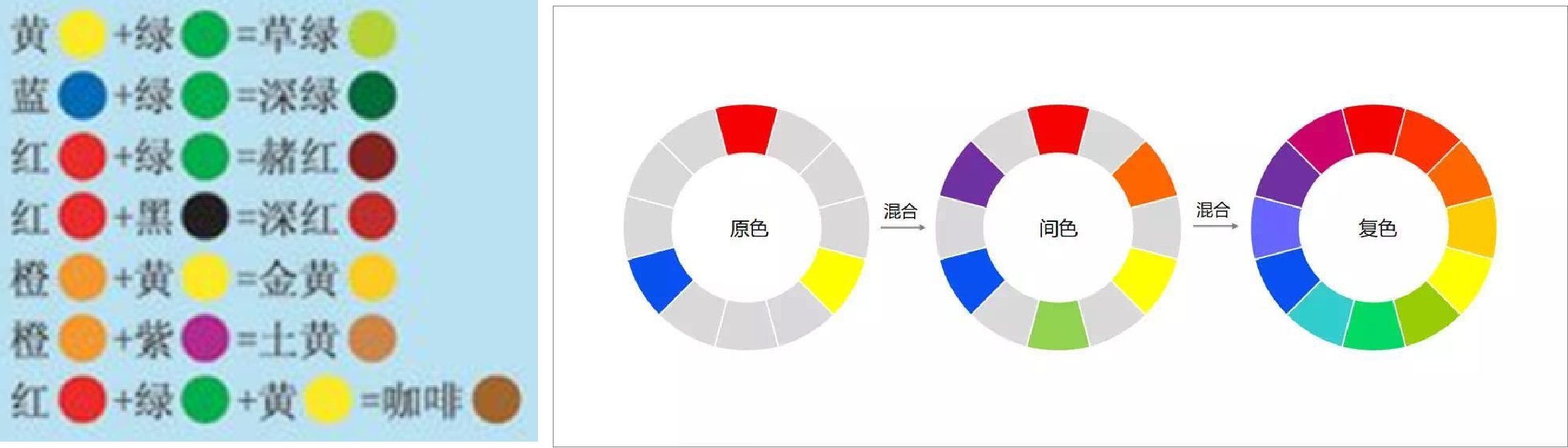 复色也可以说是由红、黄、蓝三原色按不同比例混合而得到的颜色。