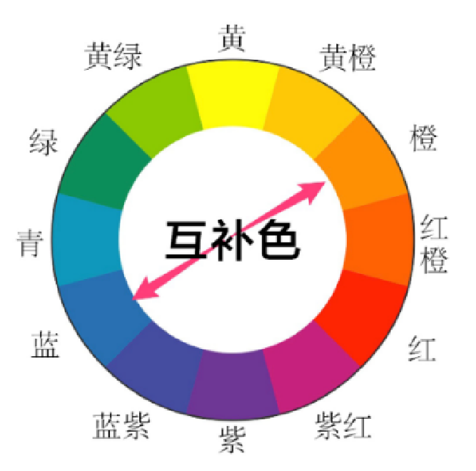 在色相环上,对角的两个颜色混合会变灰色或黑色,所以称为互补色。如红色与绿色互补,蓝色与橙色互补,紫色与黄色互补。在调色时应尽量避免使用互补色,但有时为了抵消某个太强的颜色,降低其颜色的鲜艳度,可以加入该颜色的互补色。加入互补色可以快速的降低颜色的彩度,但不能添加过量,以防混合色过于浑浊而导致调色失败。