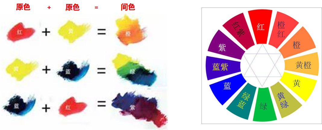 (2)颜料三原色。从颜料混合实验中,人们发现,由红、黄、蓝三种颜料以不同比例相混合,可以调配出大部分物体的颜色,而这三种颜色却不能用其它颜料混合而成。因此,人们将红、黄、蓝三色称为颜料的三原色。