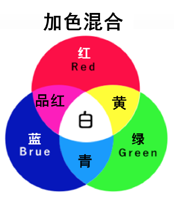 利用色光三原色混合而得到的颜色,明度会随色光混合量的增加而增强,混合色的总亮度等于相混合各色光亮的总和,因此称为加色混合。