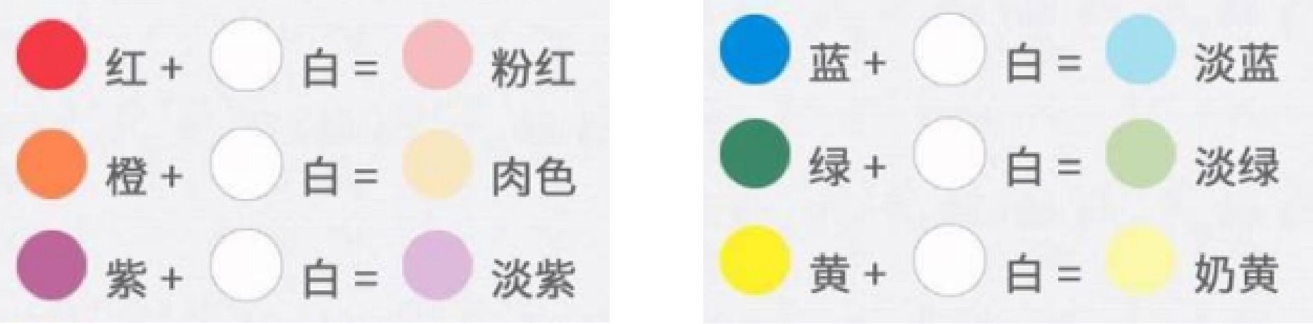 在原色、间色或复色中加入一定量的白色,可调配出粉红、肉色、淡紫等等,如图所示;加入黑色,则可调配出棕色、褐色等。