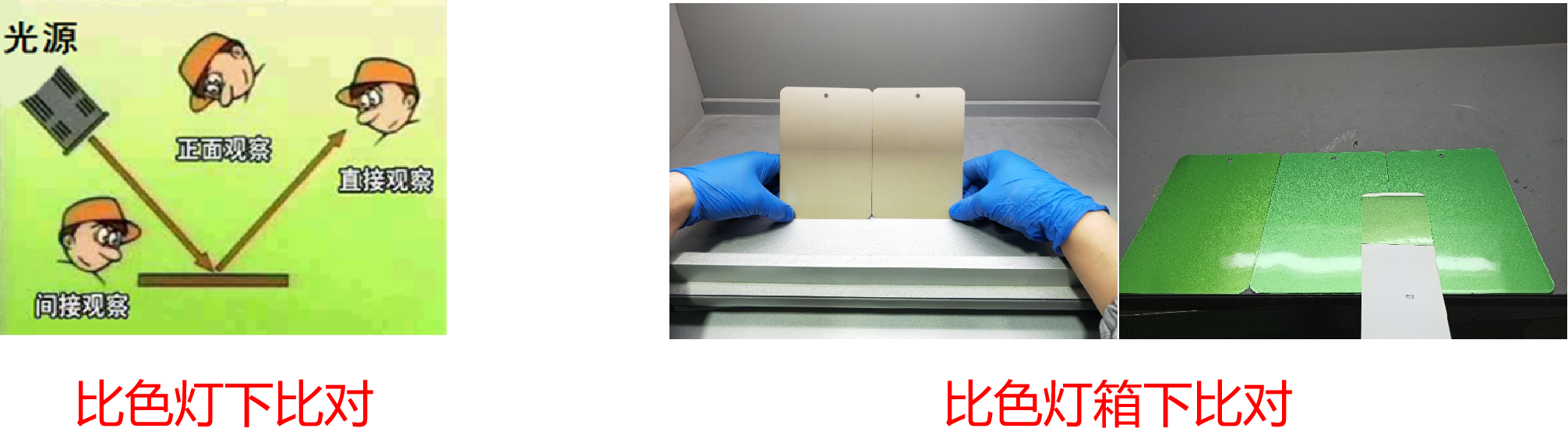 色板比对就是把试板和目标板放在一起,用肉眼判断两个板件的颜色是否相同,就像这样。在进行色板比对时,受不同的观察者、观察方法、光源种类、周围环境、试样大小等因素影响,会产生不同的结果,所以在色板比对时,我们需要注意以下几点: