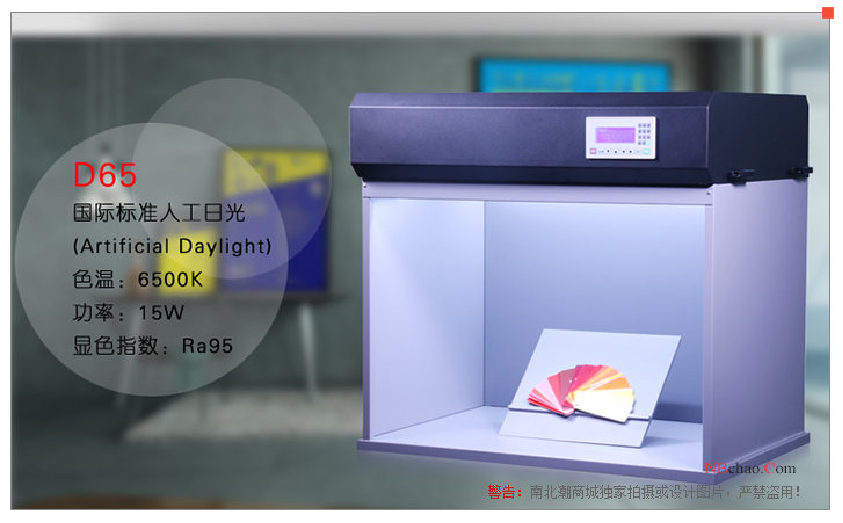 如果没有合适的自然光源,可以使用含有D65光源的配色灯箱进行比色。D65光源与太阳光具有相近的光谱分布,具有极高的显色性能,在D65光源下看到的颜色与在日光下看到的颜色最为接近。观察金属或珍珠颜料颗粒效果时可以在强光光源下进行。