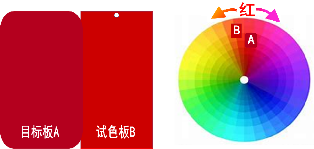 在分析色调差异时,首先确定目标板和试色板的主色调,然后确定目标板、试色板色调的偏向,从而确定了两块色板的色调差异。如图所示AB两块色板,其主色调都是红色,把这两块色板放在色相环上进行颜色定位的话,可以分析得出两块色板的色调差异:目标板A靠近紫色一边,所以色调偏紫、试色板B靠近橙色一边所以色调偏橙。