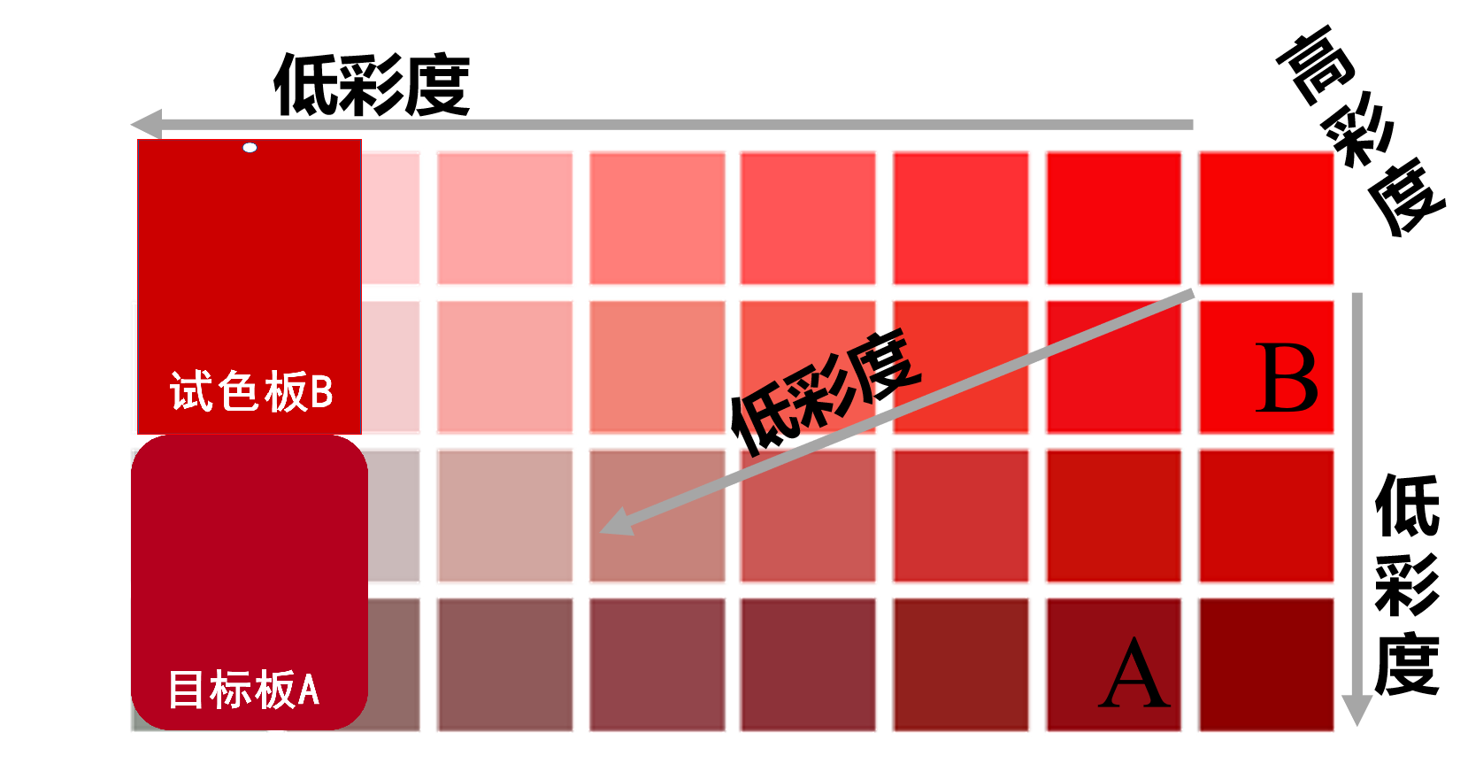 彩度可以简单的理解为颜色接近其光谱色的程度。当两块色板比对彩度差异时,可以将色板与彩度最高的颜色进行比对,或将色板与对应的主色彩度变化图进行比对,越接近光谱色的颜色彩度越高,反之则彩度低,从而可以确定两块色板的彩度差异。如图所示AB两块色板,与彩度变化图比对后,可以分析得出其彩度差异:A板远离红色光谱色,彩度浑浊;B板比A板更接近红色光谱色,彩度相对鲜艳。