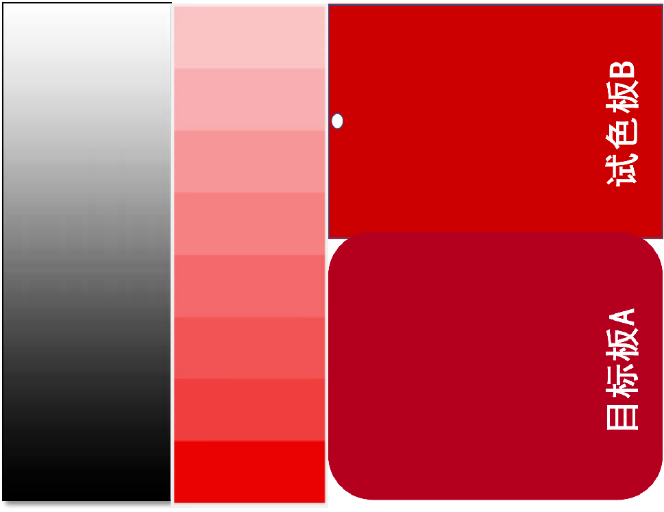 明度是人眼对颜色所感受到的亮暗程度,比对明度差异时,可以将目标板和试色板与黑白渐变图比较,按照眼睛的感觉,判断两块色板的深浅、亮暗,从而确定了两块色板的明度差异。如图所示AB两块色板,与黑白渐变图比对后,可以分析得出其明度差异:A板靠下所以明度要暗、深一点,B板靠上所以明度要亮、浅一点。