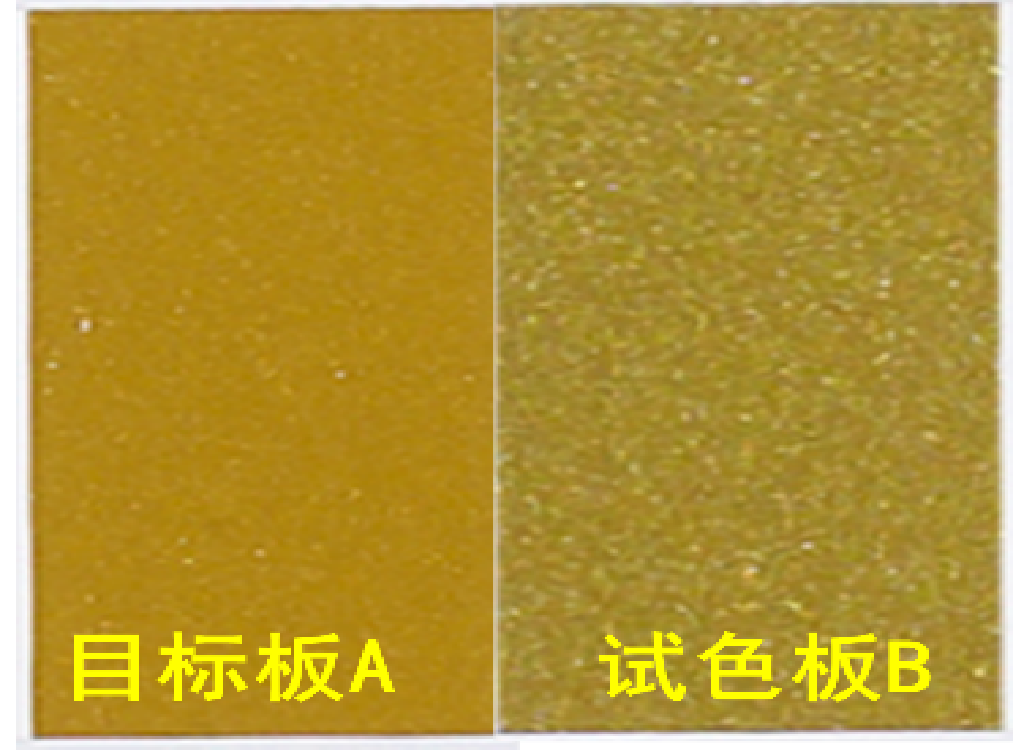 金属漆里面的金属颜料颗粒,有大小、多少、闪烁程度不同之分,当两块色板比对时,按视觉感觉判断颜料颗粒效果的差异。如图所示AB两块色板,通过对比分析得出:A板相对于B板来说颗粒偏小、偏少、不够闪;B板相对于A板来说颗粒偏大、偏多且偏闪。