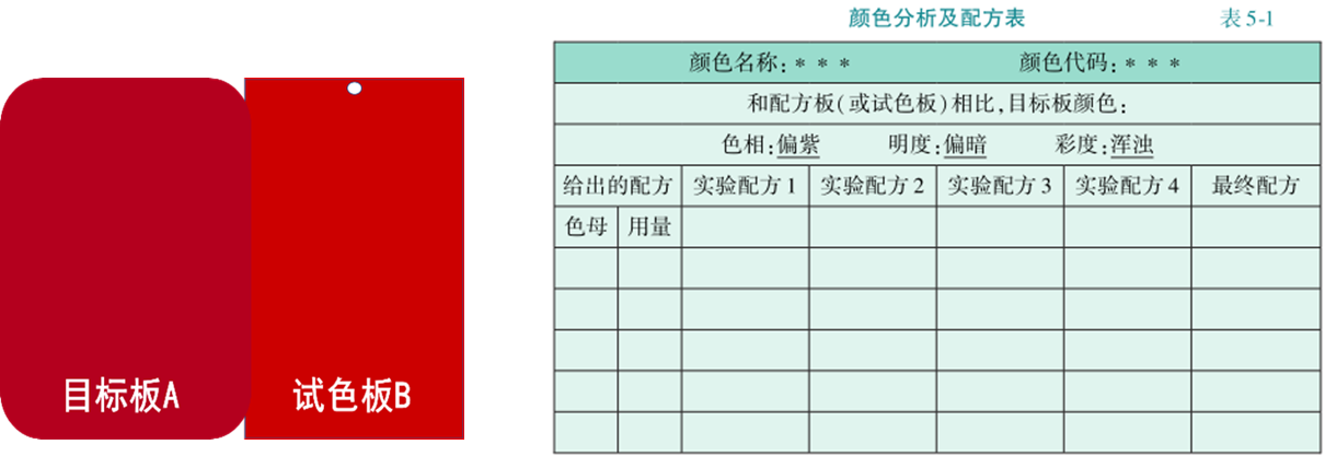和配方板或试色板相比,目标板颜色色相偏紫、明度偏暗、彩度偏浑浊。