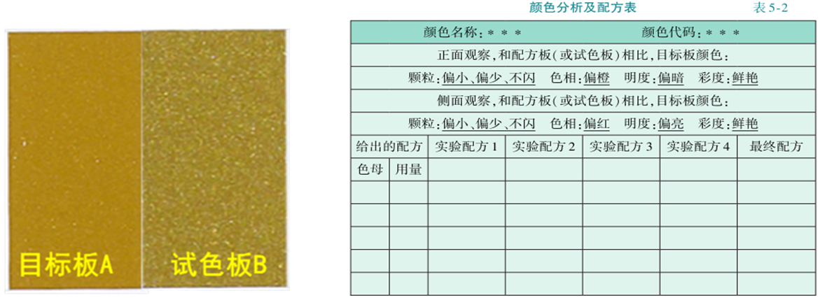金属漆颜色属性正视、侧视效果有时一致,有时不一致,所以必须分别分析和记录,同时还必须填写颜料颗粒效果差异。