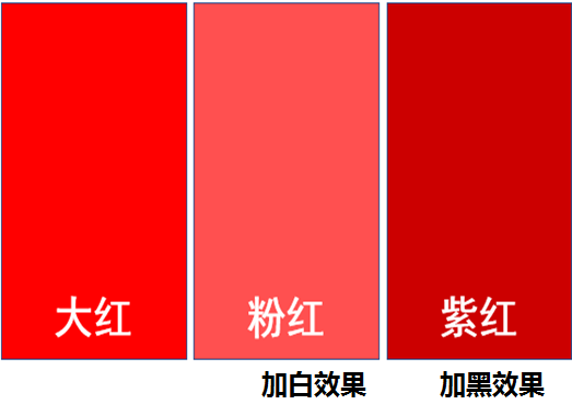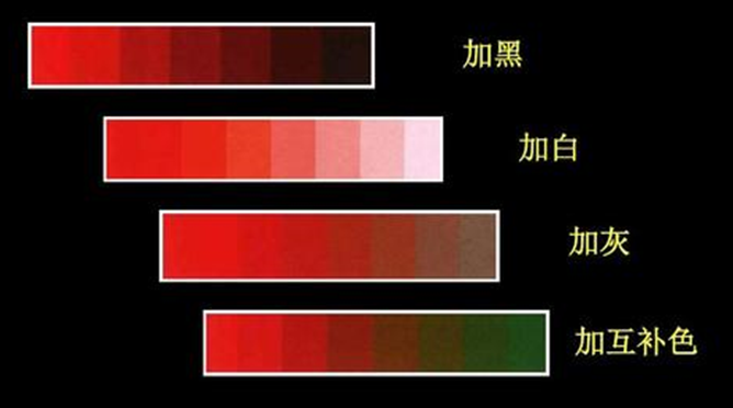 如红色中加入白色会使颜色变浅变浊变粉,加入蓝相黑会使颜色变深变浊变紫。如果不想改变色调,只要使红色变浅变亮一点的话,可加入橙色或少量黄色;