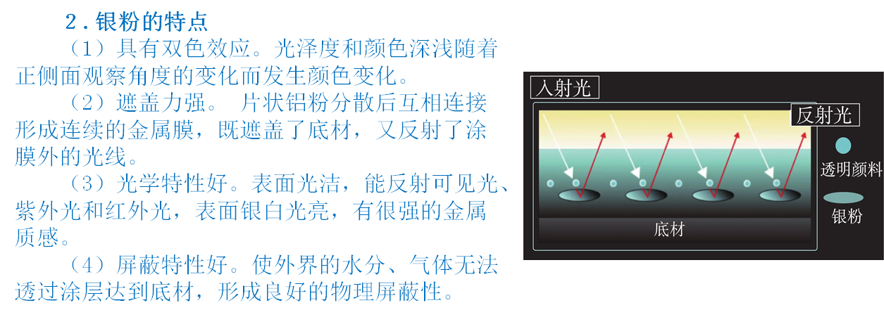 2. 银粉的特点:双色、遮盖力、光学性、屏蔽性