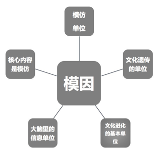 “模因”第一次出现是在Richard Dawkins的《自私的基因》一书中,Dawkins在该书最后提出了“模因”的概念,他认为模因是文化进化的一个基本单位,人们可以利用模因这个概念对某种事物的进化、发展规律进行阐述(1976)。模因的核心内容是通过对某种事物进行模仿,使其得到传播以及发展与创新。模因现象存在于社会生活的各个角落,换而言之,任何事物在任何时候都有成为模因的可能。模因定义的形成经历了两个阶段:第一阶段是模因被看作是文化遗传单位或者模仿单位, 模因的类型在生活中有曲调旋律,想法思潮,时髦用语,时尚服饰,建房搭屋,器具制造等模式(Dawkins 1976: 206)。“一座教堂的建筑,仪式,规则,音乐,艺术,书写方式都是相互协作传播的模因集合。”(Dawkins 1976: 212) 第二阶段是模因作为大脑里的信息单位,是存在于大脑中的一个复制因子,而在现实世界里,模因的表现型是词语、音乐、图像、服饰格调,甚至手势或脸部表情(Dawkins 1982:109)。