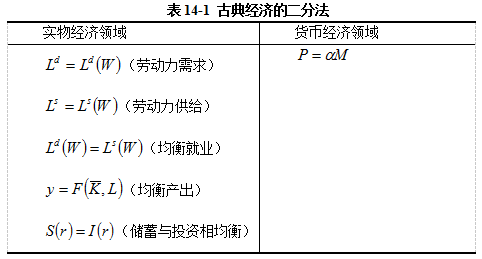 经过上述分析,我们就获得了古典经济学中的二分法:一边是实物经济领域,就业、产出和投资在这一领域中被决定;另一边是货币经济领域,价格水平在这一领域被决定,如表14-1所示。