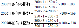 利用表2-2中的数据,我们可以计算2005年、2006年和2007年的价格指数(以2005年为基年)。