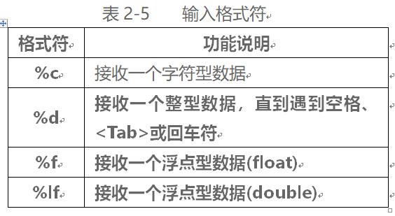 ② 与printf( )函数一样,“格式串”中既可以含格式符,也可以含非格式符。 scanf( )中格式符的意义同 printf( ),如表2-5所示。