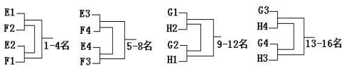 第三阶段由E、F组的前2名交叉打附加赛决出1—4名,E、F组的后2名交叉打附加赛决出5—8名,G、H组的前2名交叉打附加赛决出9—12名,G、H组的后2名交叉打附加赛决出13—16名。见图5。