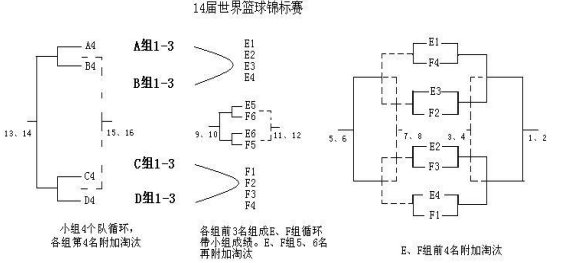 14届世界篮球锦标赛男女各有16个队参加比赛,比赛分三个阶段进行,见图3。