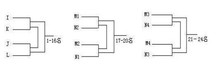 第三阶段由I、J、K、L小组的同名次打附加赛,分别决出1—16名的队,M、N组前、后2名分别交叉打附加赛,决出17—24名的队。见图4。