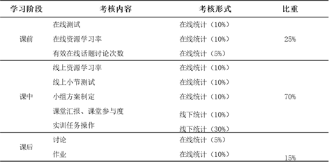 课堂评价占总成绩的25%。以单项工作任务为载体,记录教学过程分析、计划、执行、检查的能力。客观指标包括:课前在线测试、在线资源学习率、有效话题讨论次数;课中小节测试、方案制定、课堂汇报、课堂参与度、技能操作等;课后主题讨论、作业。如表1所示
