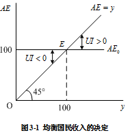 在图3-1中,纵轴AE表示总支出,横轴表示总收入(或总产出),45°线上的各点都表示支出和收入相等。假设某经济社会的总支出为100亿美元,从纵轴100出发的与横轴平行的直线就表示无论该经济社会的收入是多少,对应的总支出都是100亿美元。则直线