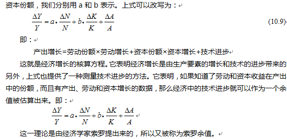 索洛采用了下面的方程式来分析各影响因素对经济增长的贡献: