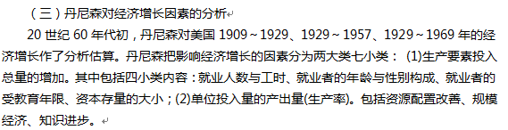 美国经济学家爱德华·丹尼森是继索洛之后最全面分析经济增长因素的经济学家。他把经济增长因素分为两大类:生产要素投入量和生产要素生产率。关于生产要素投入量,丹尼森把经济增长看成是劳动、资本和土地投入的结果,其中土地可以看成是不变的,其余两个则是可变的。关于生产要素生产率,丹尼森把它看成是产量与投入量之比,即单位投入量的产出量。生产要素生产率主要取决于资源配置状况、规模经济和知识进步。具体而言,丹尼森把影响经济增长的因素归结为六个,即:(1)劳动;(2)资本存量的规模;(3)资源配置状况;(4)规模经济;(5)知识进步;(6)影响单位投入产出量的其他因素。