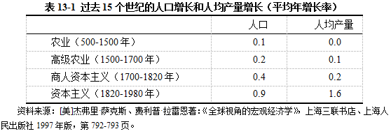 从历史上来看,经济增长实际上只是近现代社会出现的现象。美国经济史学家和研究经济增长问题的专家安格斯·麦迪森对由1980年倒推15个世纪期间的人口增长和人均产量增长的情况进行了研究分析后提出,人类社会的经济增长可以分为四个阶段(见表13-1)。只有从16世纪的第2个阶段开始,经济才有了低水平的缓慢增长,而只是到了资本主义阶段,才出现了经济的较快增长。