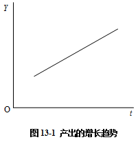 经济增长问题实际上是经济社会潜在生产能力及其现实表现的长期变化趋势问题。这种趋势可以用一条长期产出增长的趋势线来表示,如图13-1所示。