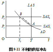 图9-11表明一种不利的供给冲击如何影响经济(供给冲击也会降低潜在的产出水平,从而使长期总供给曲线向左移动,但我们这里不考虑这种影响)。图中,不利的供给冲击使短期总供给曲线从向上平移到