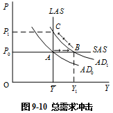 随着时间推移,较高的总需求推动了价格与工资的上涨。随着价格水平上升,需求量减少了,经济沿新的总需求曲线从点向